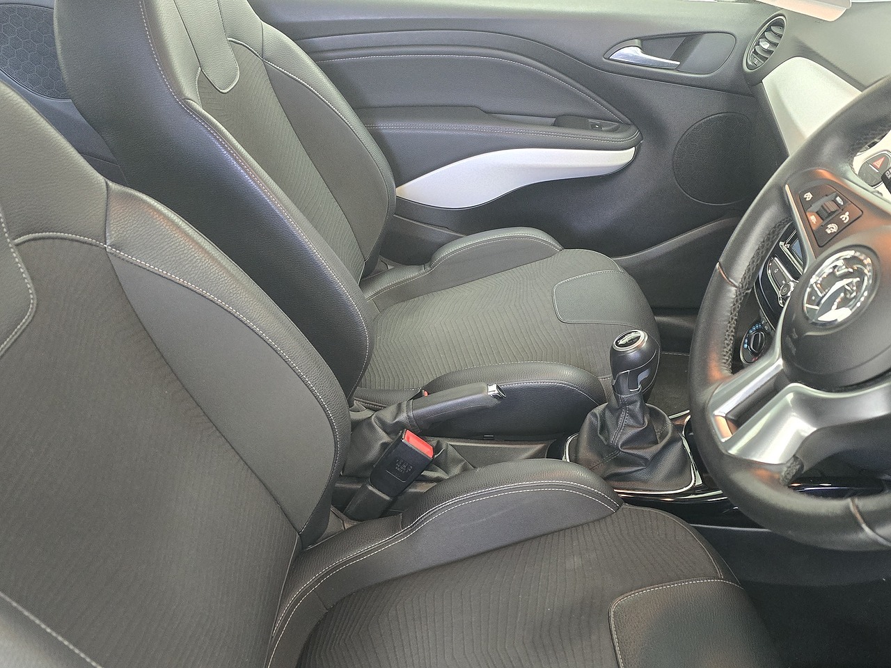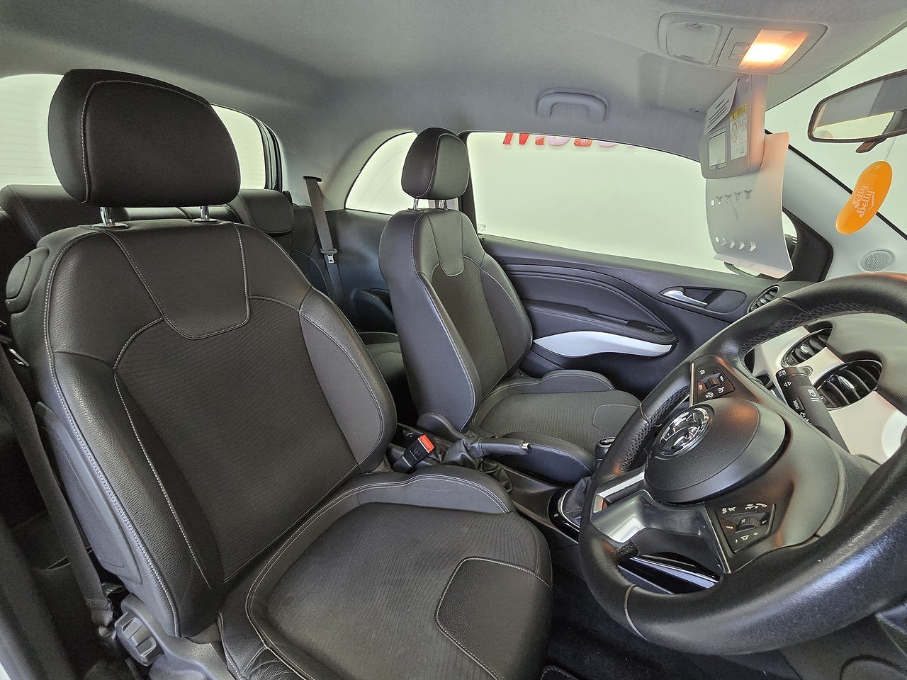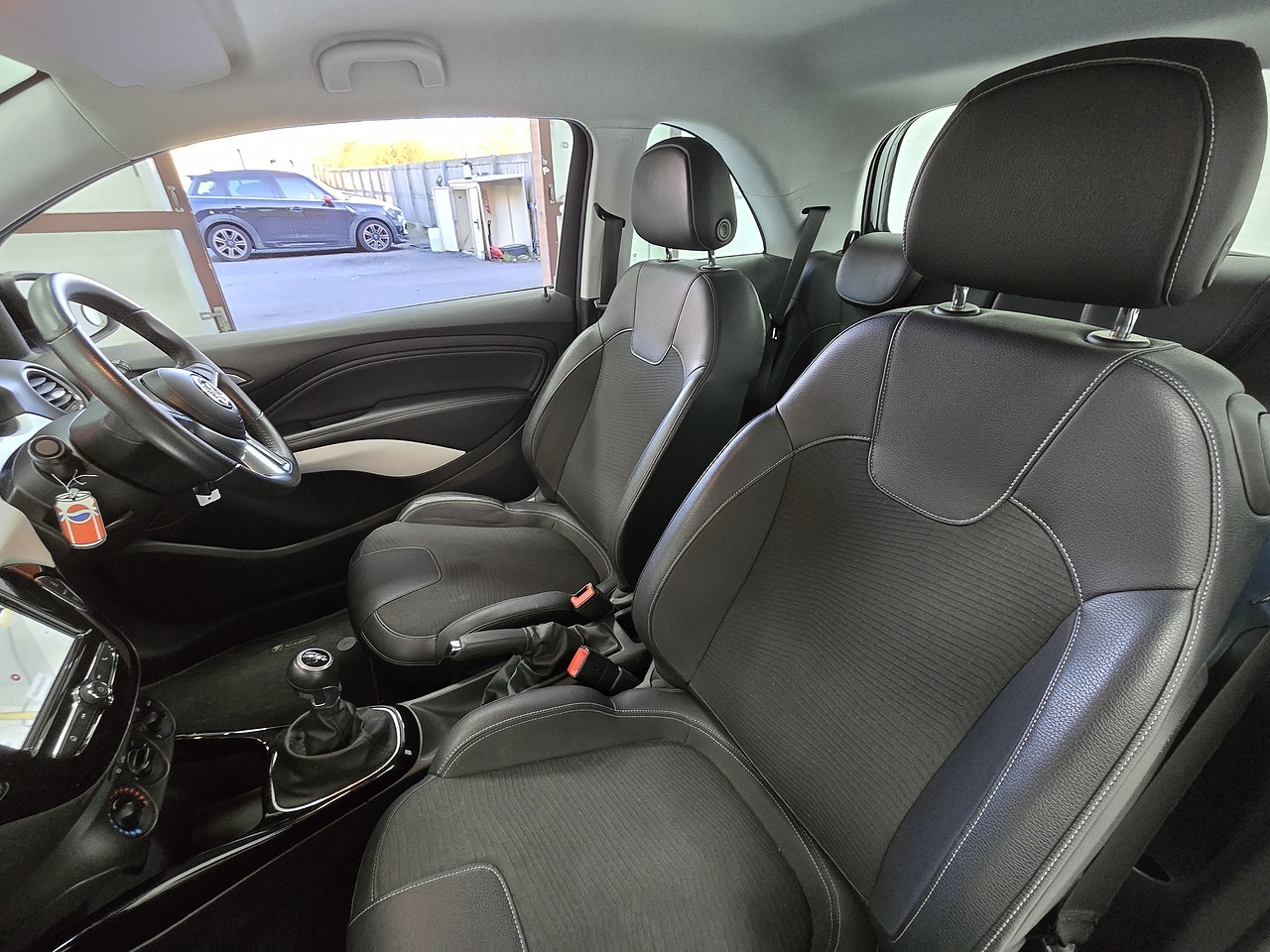 Finished in Ice White with a Black roof and mirror caps, Partial Black Leather/Cloth Upholstery and 17" Gloss Black Alloy Wheels.
